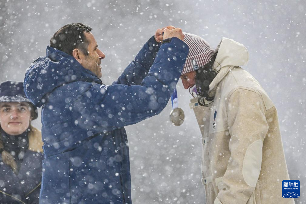 2月21日,法国选手西蒙(右)在颁奖仪式上佩戴奖牌。