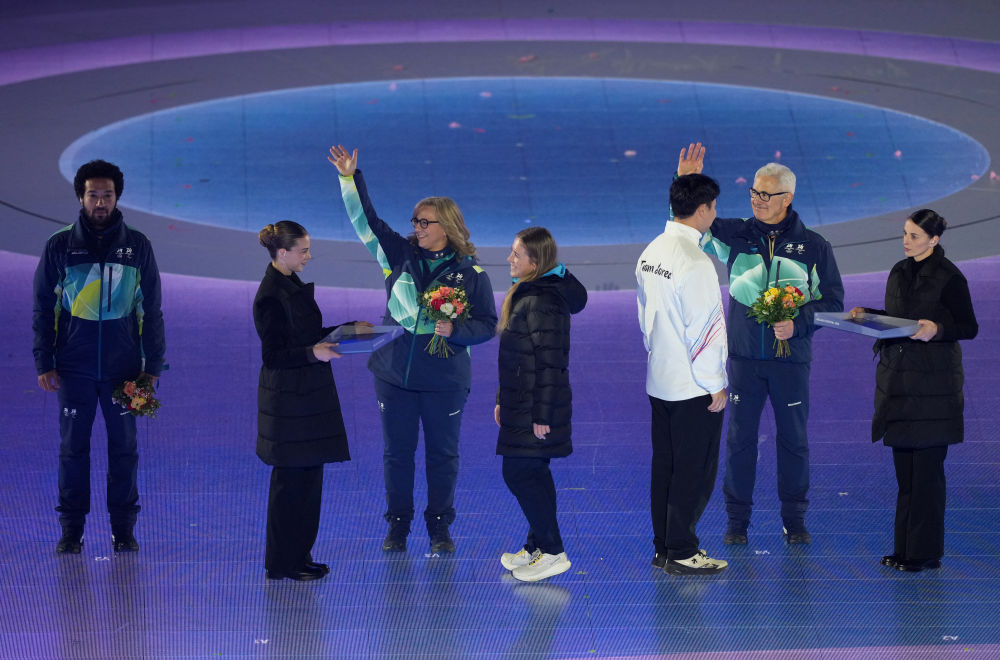 ↑中国速度滑冰运动员殷琦(右)在闭幕式入场。