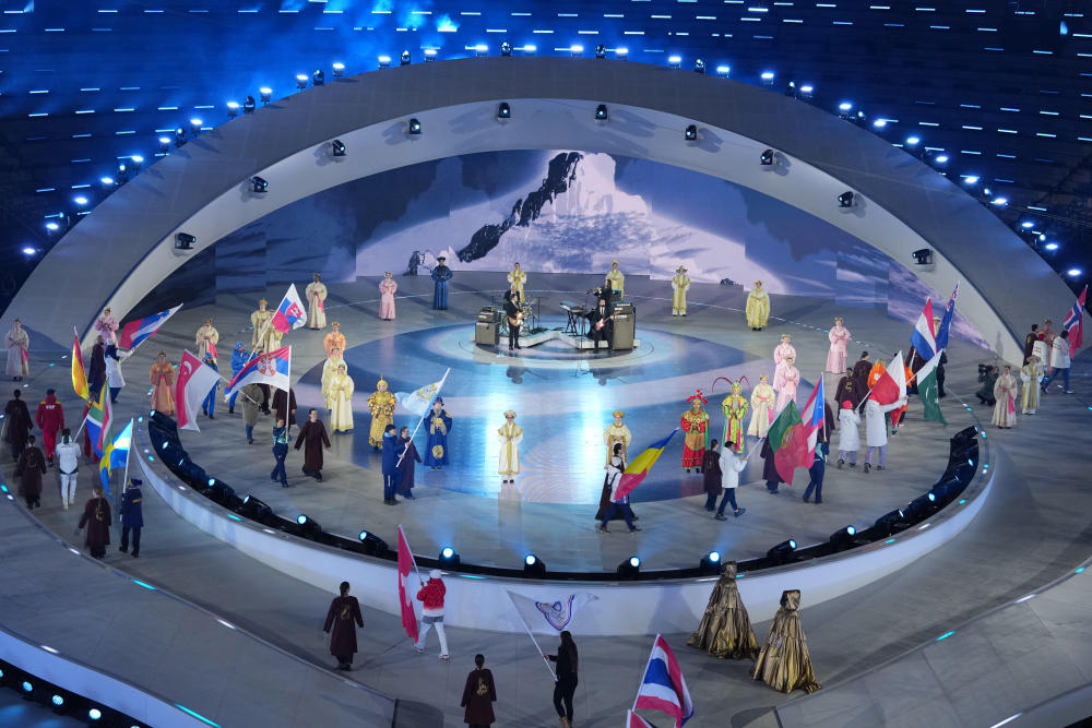 ↑中国自由式滑雪运动员齐广璞(中)在闭幕式入场。