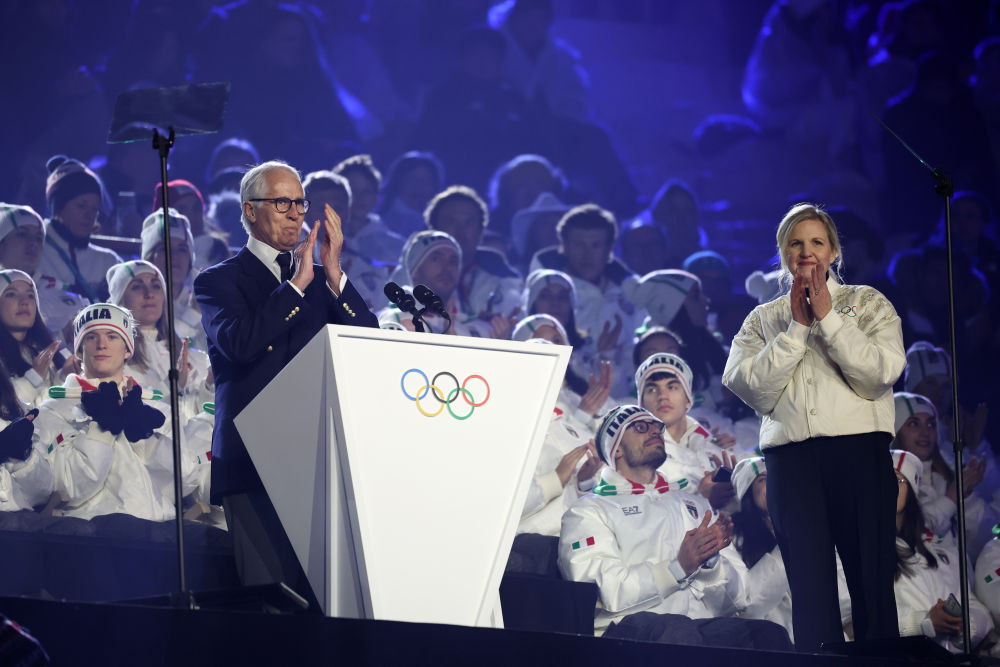 ↑意大利国旗与国际奥委会会旗在闭幕式现场升起。