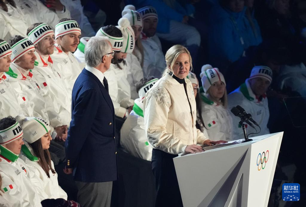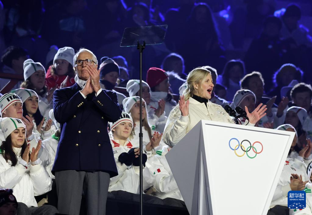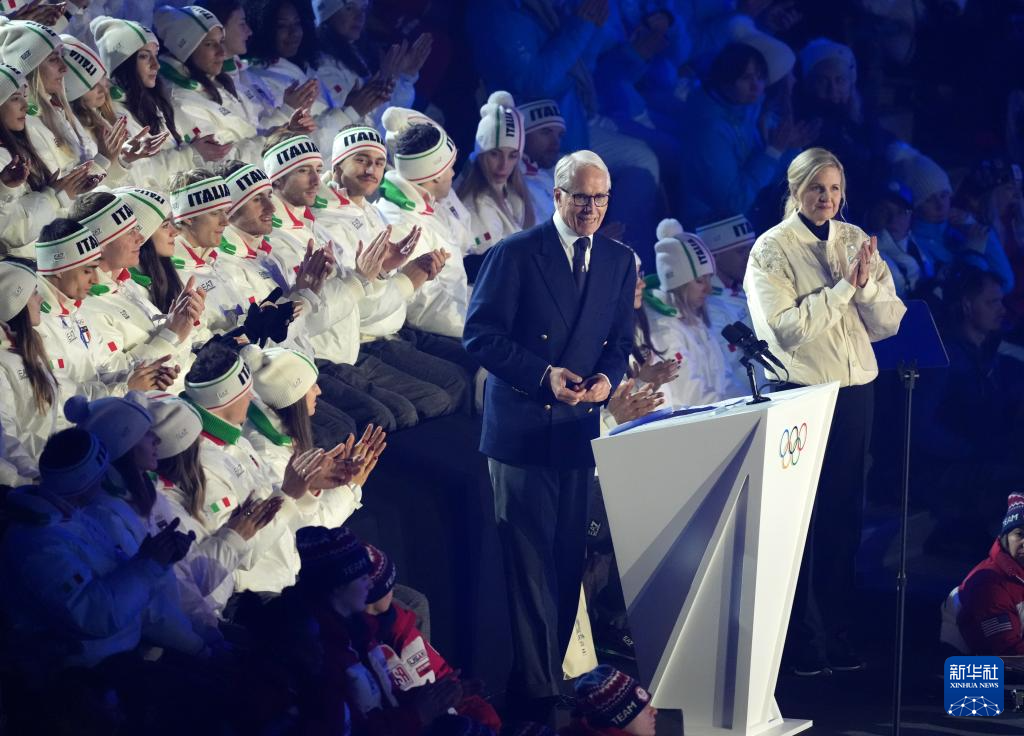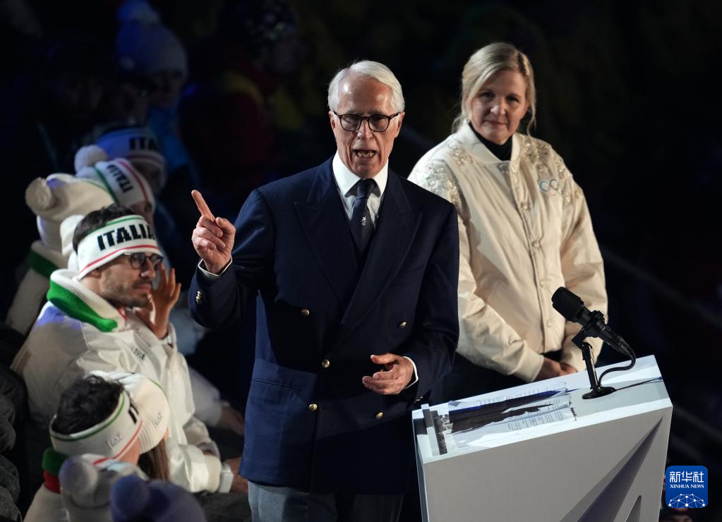 2月22日,米兰-科尔蒂纳冬奥会组委会主席乔瓦尼·马拉戈(前左)在闭幕式上发言。
