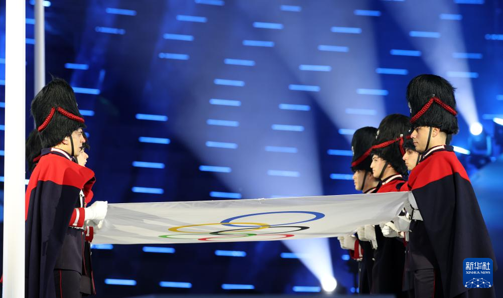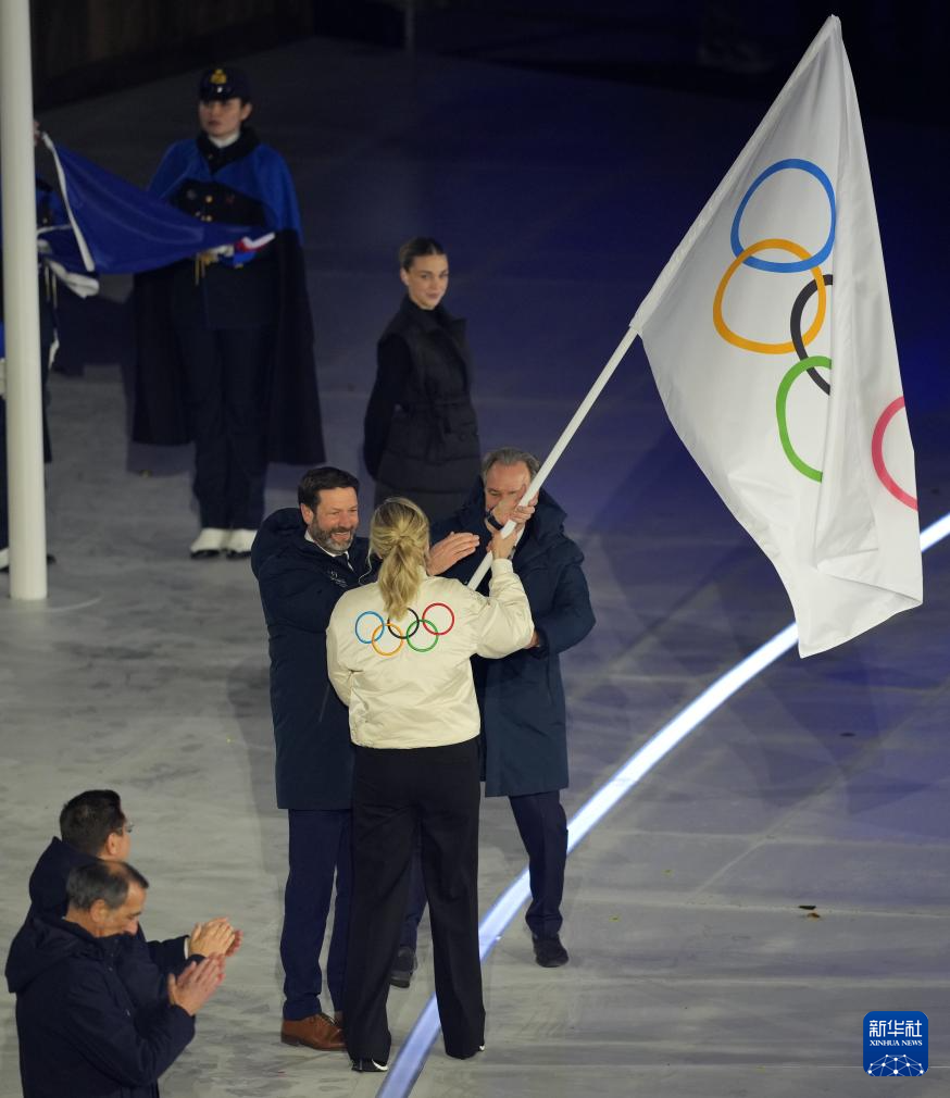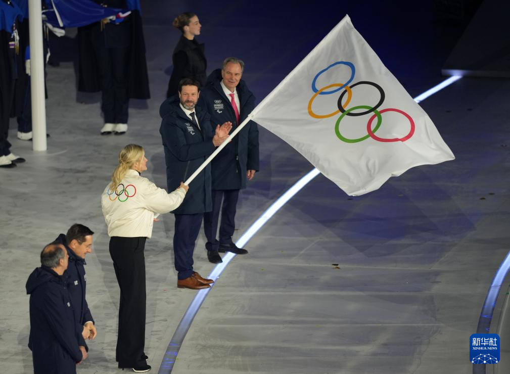 这是2月22日在闭幕式上拍摄的奥林匹克会旗交接仪式。
