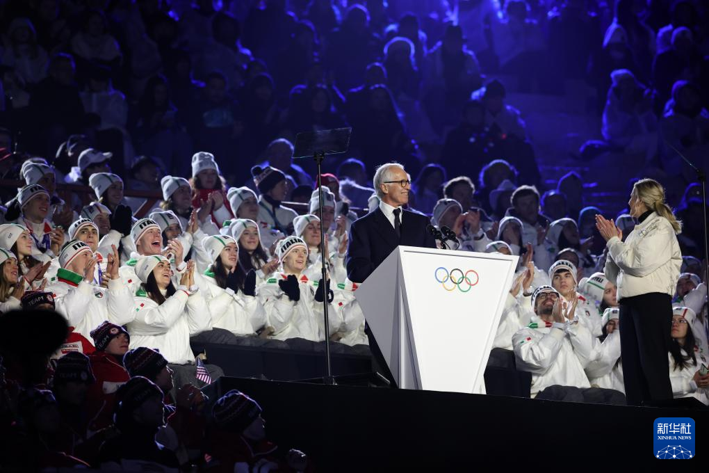 2月22日,米兰-科尔蒂纳冬奥会组委会主席乔瓦尼·马拉戈(右二)在闭幕式上发言。