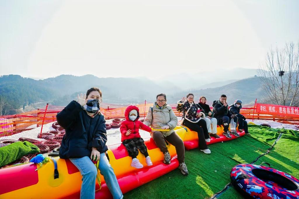 游客在济南莱芜区雪野街道王老村体验冰雪趣味项目