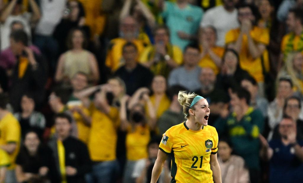 ↑2023年8月12日,女足世界杯四分之一决赛,澳大利亚队球员卡彭特在点球大战中庆祝罚入点球。新华社记者 李一博 摄