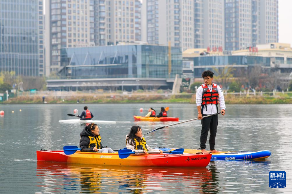 早春时节,一堂水上运动公开课在浙江省宁波市江北区甬江街道星湖公园进行。青年学员们划着皮划艇、桨板,在教练员指导下泛舟湖面,享受水上运动的乐趣。