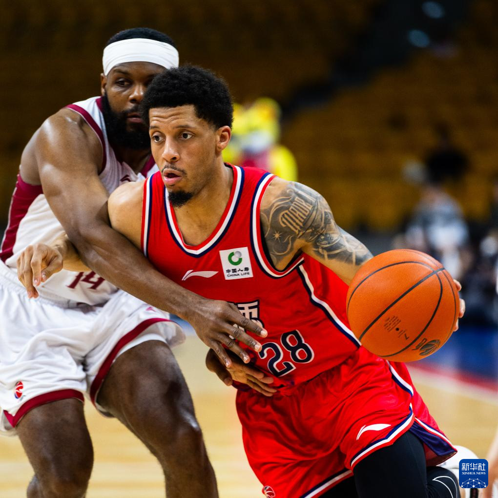 3月23日,广州朗肽海本队球员威金顿(右)在比赛中突破山西汾酒队球员奈特的防守。