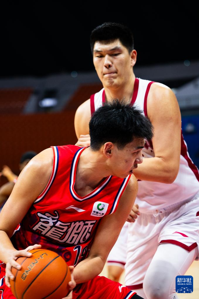 3月23日,广州朗肽海本队球员徐昕(左)在比赛中扣篮。