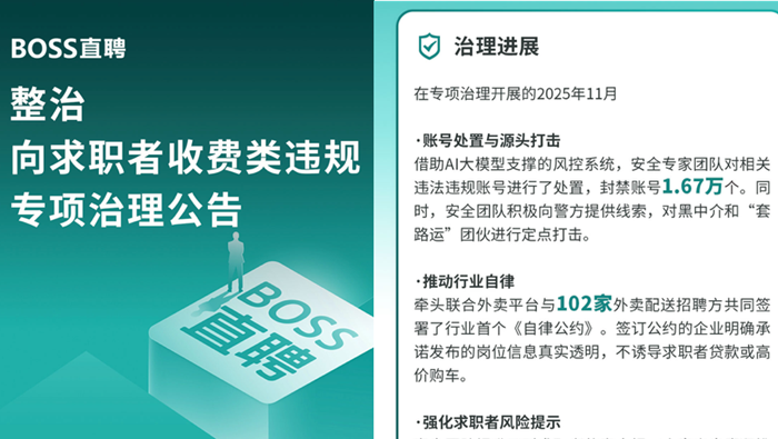 BOSS直聘:?jiǎn)卧路饨?.67萬(wàn)涉“套路收費(fèi)”類賬號(hào),推送400萬(wàn)次風(fēng)險(xiǎn)提示