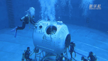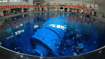 這里是航天員模擬失重水槽訓練場。當飛船繞地心運動時,會產(chǎn)生失重。航天員要在失重狀態(tài)下進行空間出艙活動和裝配維修等任務(wù)。實踐證明,模擬失重水槽訓練是在地面上進行航天員艙外活動訓練的最為有效方法。