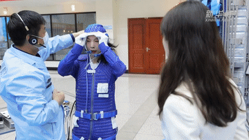 這里是離心機訓練場。離心機由一個八米長的旋轉(zhuǎn)臂和飛行模擬座艙組成,它所產(chǎn)生的離心力通常用地心引力的倍數(shù)表示。例如2G等于兩倍地球引力,大概相當于過山車從最高點急速俯沖到最低點時的壓迫感。普通人最多能承受4G的離心力,而像亞平一樣的航天員則要進行8G的過載訓練。