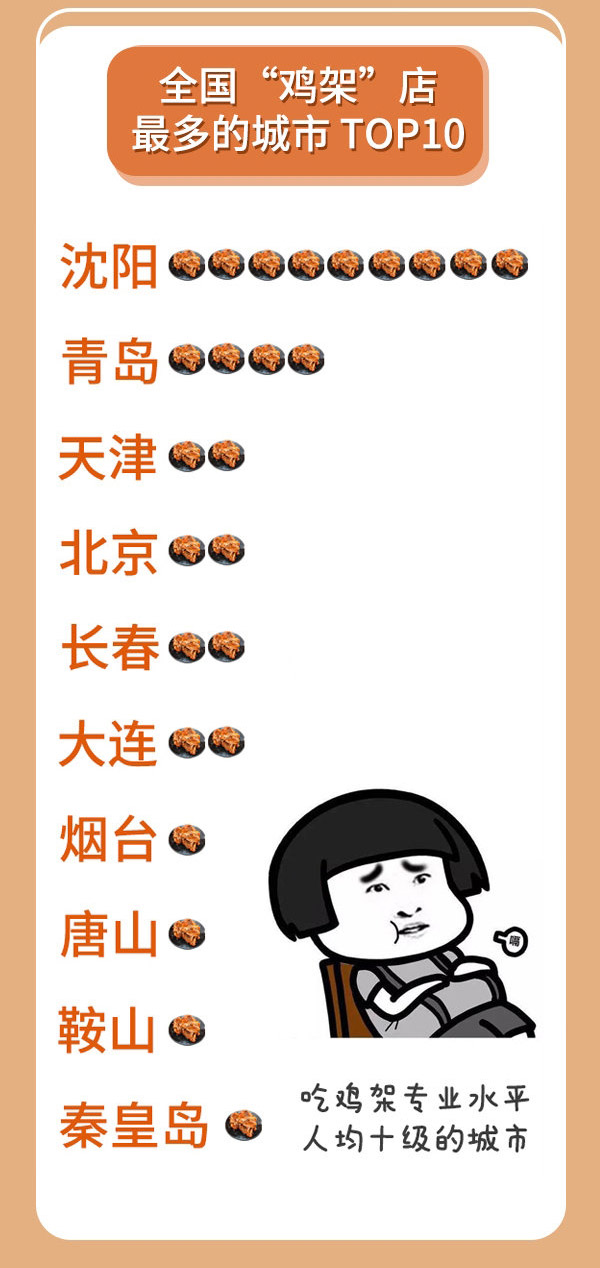 ????? 據(jù)高德地圖統(tǒng)計(jì),全國“雞架”店最多的城市非沈陽莫屬,青島、天津、北京等城市也位于榜單前列。