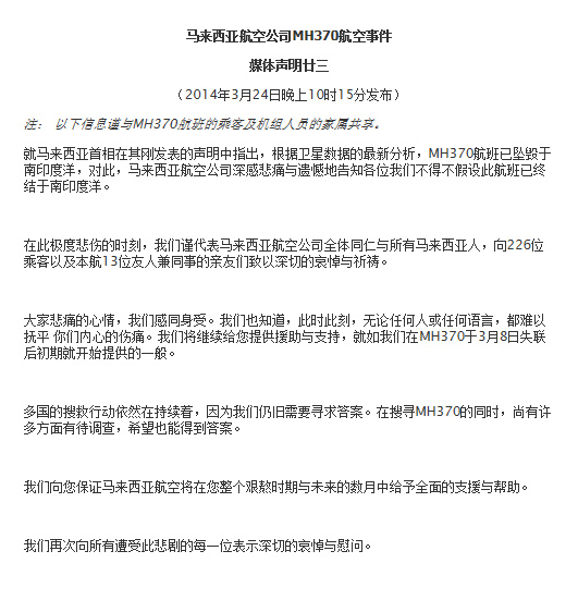 ????馬航官方網(wǎng)站上的《媒體聲明廿三》表示,“在此極度悲傷的時(shí)刻,我們謹(jǐn)代表馬來西亞航空公司全體同仁與所有馬來西亞人,向226位乘客以及本航13位友人兼同事的親友們致以深切的哀悼與祈禱?!?/p>