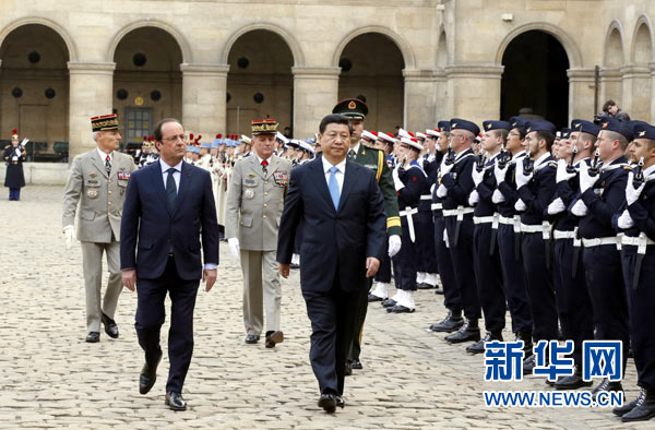 ??? 據(jù)新華社“新國際”微博3月27日報道,法國總統(tǒng)奧朗德26日下午在巴黎榮軍院廣場舉行盛大儀式,歡迎中國國家主席習(xí)近平。打破常規(guī)在榮軍院舉行歡迎儀式,奧朗德總統(tǒng)一路陪同,146名騎兵左右護(hù)衛(wèi) ......隆重的禮儀,盡顯東道主的熱情和尊重。