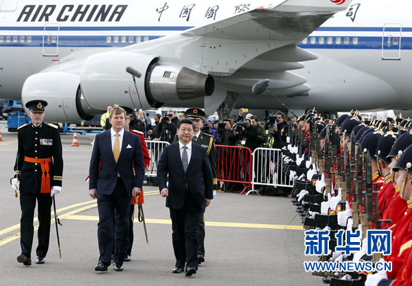 ??? 3月22日,國家主席習近平抵達阿姆斯特丹,應(yīng)荷蘭國王威廉-亞歷山大邀請,對荷蘭進行國事訪問,開啟歐洲之旅。威廉-亞歷山大在機場為習近平舉行隆重歡迎儀式。這是習近平在威廉-亞歷山大陪同下檢閱儀仗隊。新華社記者 鞠鵬 攝