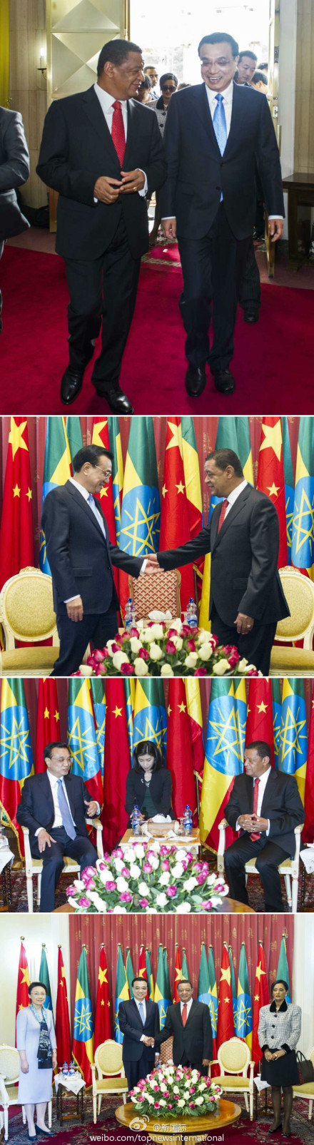新華網(wǎng)北京5月6日電?據(jù)新華社“新華視點(diǎn)”微博報(bào)道,李克強(qiáng)總理與夫人程虹當(dāng)?shù)貢r(shí)間6日上午同埃塞總統(tǒng)穆拉圖夫婦在國(guó)家宮會(huì)見(jiàn)。
