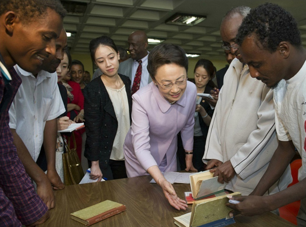 ????新華網(wǎng)北京5月6日電 據(jù)新華社“新國際”微博報道,李克強(qiáng)總理夫人程虹5日在埃塞俄比亞總理夫人羅曼·塔斯法耶的陪同下參觀了亞的斯亞貝巴大學(xué),觀摩漢語授課,與學(xué)生們交流,觀看學(xué)生們的中國文化才藝展示,還捐贈了書籍、計算機(jī)等物品。程虹說,你們是文化的紐帶,感謝你們對中國人民的情誼。你們對中國文化的熱愛感動了我,也會感動中國人民。