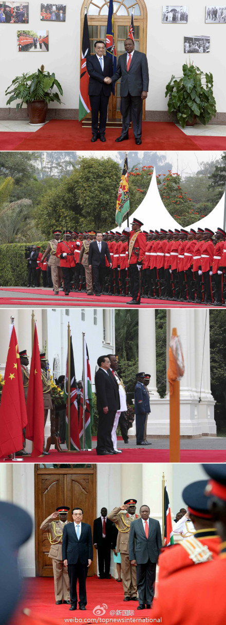 ????新華網(wǎng)北京5月10日電? 據(jù)新華社“新國(guó)際”微博報(bào)道,肯尼亞總統(tǒng)肯雅塔10日上午在國(guó)家宮為中國(guó)總理李克強(qiáng)舉行隆重歡迎儀式?,F(xiàn)場(chǎng)鳴放禮炮,軍樂隊(duì)奏兩國(guó)國(guó)歌。李克強(qiáng)檢閱了儀仗隊(duì)。