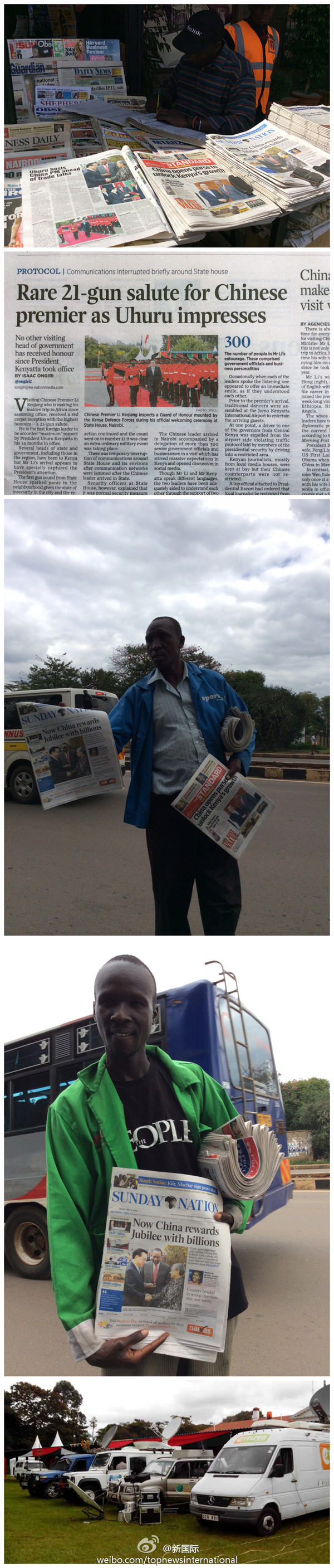 ????新華網(wǎng)北京5月11日電? 據(jù)新華社“新國際”微博報(bào)道,連日來,肯尼亞各大媒體紛紛對李克強(qiáng)總理訪肯進(jìn)行全方位報(bào)道。主要報(bào)紙均在頭版頭條大篇幅介紹訪問情況,并開辟專版引述李總理講話對肯中關(guān)系進(jìn)行述評??先箅娨暸_現(xiàn)場直播李總理和肯雅塔總統(tǒng)會見記者實(shí)況。肯媒體還高度評價(jià)中國在文化教育等領(lǐng)域的軟實(shí)力外交。