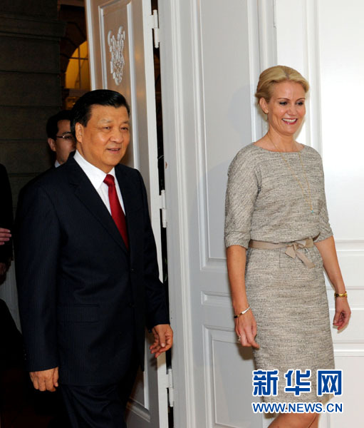 ??? 6月11日,正在丹麥進(jìn)行正式訪問(wèn)的中共中央政治局常委、中央書記處書記劉云山在哥本哈根會(huì)見(jiàn)丹麥?zhǔn)紫?、社民黨主席托寧-施密特。 新華社記者饒愛(ài)民 攝