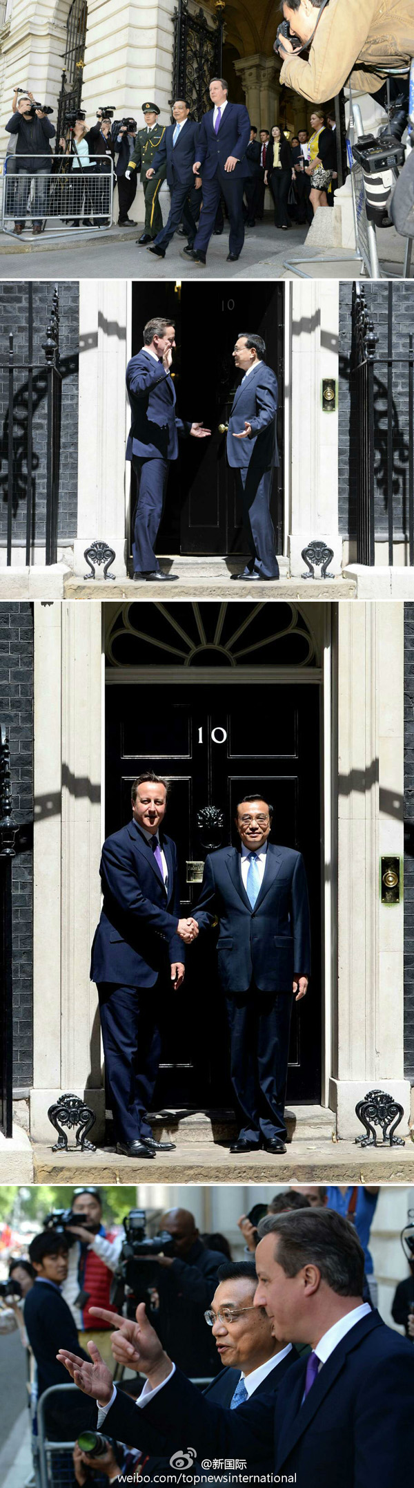 新華網(wǎng)北京6月17日電 據(jù)新華社“新國際”微博報道,17日,英國首相府所在的唐寧街附近五星紅旗飄揚,卡梅倫為到訪的李克強總理舉行隆重歡迎儀式。隨后,兩位領導人步行來到首相官邸。面對中外記者的鏡頭,李克強與卡梅倫握手合影,愉快交談。在首相府一層內(nèi)閣會議室內(nèi),兩位領導人就雙邊關系和共同關心的問題舉行會談。