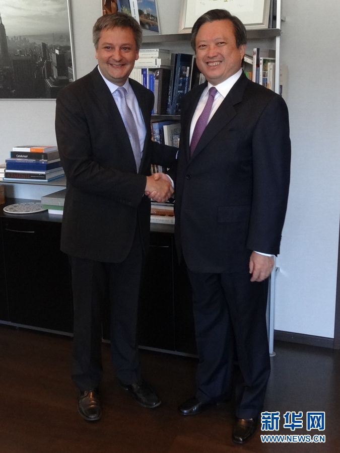 中國駐西班牙大使朱邦造與安道爾外交大臣薩沃亞會(huì)談前握手。新華網(wǎng) 周喆攝