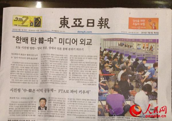 ??? 韓國(guó)《東亞日?qǐng)?bào)》在頭版顯著位置刊發(fā)習(xí)近平主席署名文章《加快自貿(mào)區(qū)談判進(jìn)程 做大利益蛋糕》金慧廷 攝