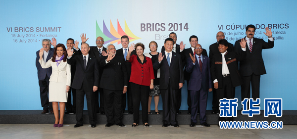????新華網(wǎng)巴西利亞7月16日電(記者陳威華、錢彤)7月16日,金磚國家同南美國家領(lǐng)導(dǎo)人對話會在巴西利亞舉行。中國國家主席習(xí)近平、巴西總統(tǒng)羅塞夫、俄羅斯總統(tǒng)普京、印度總理莫迪、南非總統(tǒng)祖馬以及蘇里南總統(tǒng)鮑特塞、阿根廷總統(tǒng)克里斯蒂娜、玻利維亞總統(tǒng)莫拉萊斯、哥倫比亞總統(tǒng)桑托斯、智利總統(tǒng)巴切萊特、厄瓜多爾總統(tǒng)科雷亞、圭亞那總統(tǒng)拉莫塔爾、巴拉圭總統(tǒng)卡特斯、秘魯總統(tǒng)烏馬拉、烏拉圭總統(tǒng)穆希卡、委內(nèi)瑞拉總統(tǒng)馬杜羅等南美國家領(lǐng)導(dǎo)人共同出席。