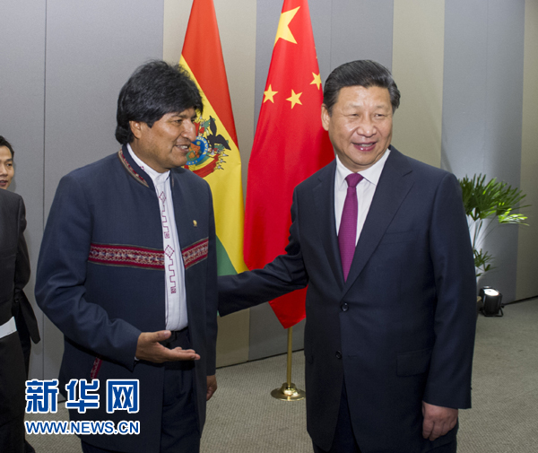 ????習近平指出,去年12月,莫拉萊斯總統(tǒng)成功訪華,我同你就兩國關系未來發(fā)展進行了深入探討。中玻關系發(fā)展很好,合作富有成果。中方愿同玻方一道,推動中玻關系邁向更高水平。雙方要保持高層交往以及政黨、立法機關、地方合作,夯實中玻長期友好政治基礎。兩國雙邊貿易增長迅速,在玻利維亞開展的重點合作項目進展順利,中方為玻方研制并發(fā)射的首顆通信衛(wèi)星已在軌交付并運行良好。雙方要繼續(xù)挖掘潛力,擴大貿易、能源、礦業(yè)、基礎設施建設等領域互利合作。雙方要加強人文交流,增進兩國人民相互了解和友誼。中方愿同玻方繼續(xù)在聯(lián)合國、“七十七國集團+中國”等多邊機制中保持密切溝通和配合。