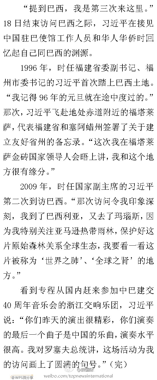 新華網(wǎng)北京7月19日電? 據(jù)新華社“新國際”微博報道,“提到巴西,我是第三次來這里?!?8日結束訪問巴西之際,習近平在接見中國駐巴使館工作人員和華人華僑時回憶起自己同巴西的淵源。