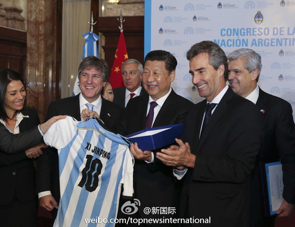 ????新華網(wǎng)北京7月20電 據(jù)新華社“新國際”微博報(bào)道,正在阿根廷進(jìn)行國事訪問的國家主席習(xí)近平當(dāng)?shù)貢r(shí)間19日上午會(huì)見了副總統(tǒng)兼參議長布杜和眾議長多明格斯。會(huì)見后,布杜向習(xí)近平主席贈(zèng)送了阿根廷國家足球隊(duì)10號球衣。在剛結(jié)束的世界杯比賽中,阿根廷國家隊(duì)10號球員為梅西。