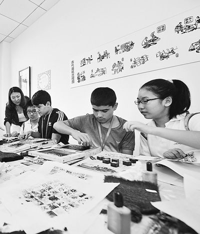 2014年8月14日,上合組織成員國首批中學生交流夏令營來到天津。圖為來自塔吉克斯坦的中學生與中國學生一起體驗活字印刷術(shù)。