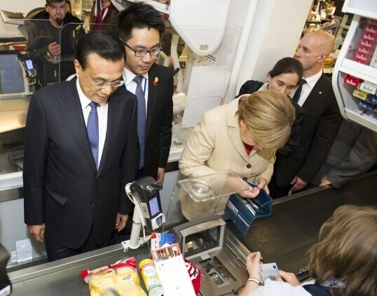 在超市的入口,默克爾拿起了一個提籃,轉(zhuǎn)頭對李克強總理說:“你不用拿了,我們用一個就行。”