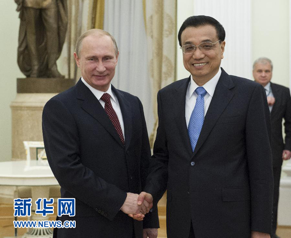 10月14日,國務(wù)院總理李克強(qiáng)在莫斯科克里姆林宮會見俄羅斯總統(tǒng)普京。 新華社記者 饒愛民 攝