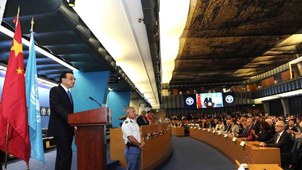10月15日,中國國務(wù)院總理李克強(qiáng)在格拉齊亞諾總干事的陪同下在位于羅馬的聯(lián)合國糧農(nóng)組織總部發(fā)表演講。 新華社 圖