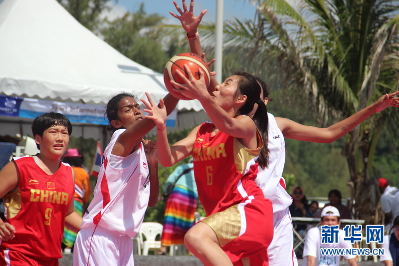 ??? 11月16日,中國(guó)沙灘籃球運(yùn)動(dòng)員房玲玲(左三)與安靜(左一)在比賽中。中國(guó)體育代表團(tuán)16日在泰國(guó)普吉舉行的第四屆亞洲沙灘運(yùn)動(dòng)會(huì)上勇奪2枚金牌和2枚銅牌。當(dāng)天比賽全部結(jié)束時(shí),中國(guó)隊(duì)以3金2銀5銅的成績(jī)暫列獎(jiǎng)牌榜第五。新華社發(fā)(塔納攝)