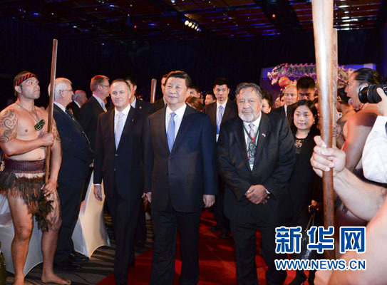 ????習近平和夫人彭麗媛抵達時,新西蘭總理約翰·基夫婦迎接,毛利族代表以傳統(tǒng)方式歡迎。在毛利族勇士和中國舞龍引領下,習近平和彭麗媛步入大廳,全場起立鼓掌。毛利族青年用歌聲表達喜悅和友誼。