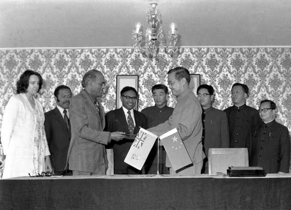????(1975年11月5日,中國與斐濟建交。圖為中國和斐濟在澳大利亞首都堪培拉簽署建交公報后,雙方代表交換文件。新華社發(fā))
