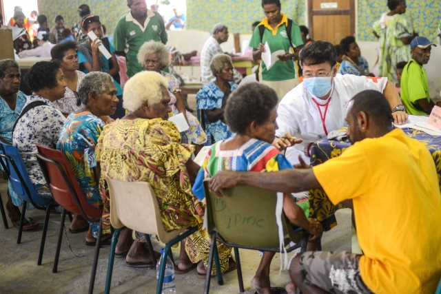 ????(圖為2014年9月5日,中國海軍和平方舟醫(yī)院船的前出醫(yī)療分隊前往位于瓦努阿圖首都維拉港郊區(qū)的美麗村,為因路途較遠而不方便前往和平方舟醫(yī)院船就診的當?shù)鼐用襁M行醫(yī)療服務。新華社記者覃海石攝)