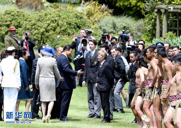 ????在總督府前的草坪上,5名勇士赤膊光足,身系草裙,一面揮舞長矛,一面吆喝,并不時吐出舌頭。為首的勇士緩緩走到習(xí)主席面前,將一把短劍投在地上,習(xí)主席俯身拾起。毛利族人確定習(xí)主席一行是為和平而來的善者。隨后,毛利族女子引吭高歌,數(shù)十名毛利族青少年跳起傳統(tǒng)的哈卡舞……