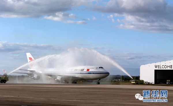 ???? ?11月21日,國家主席習(xí)近平抵達楠迪,開始對斐濟進行國事訪問并將同太平洋建交島國領(lǐng)導(dǎo)人舉行會晤。圖為習(xí)近平乘坐的專機在楠迪國際機場跑道上滑行穿過“水門”,這是當?shù)亟o予最尊貴客人的禮遇,表達為客人“洗塵”。 新華社記者 丁林 攝