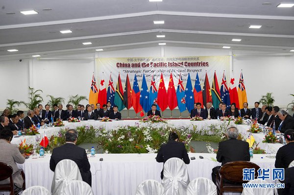 ???? 11月22日,國(guó)家主席習(xí)近平在楠迪同斐濟(jì)總理姆拜尼馬拉馬、密克羅尼西亞聯(lián)邦總統(tǒng)莫里、薩摩亞總理圖伊拉埃帕、巴布亞新幾內(nèi)亞總理奧尼爾、瓦努阿圖總理納圖曼、庫(kù)克群島總理普納、湯加首相圖伊瓦卡諾、紐??偫硭忍窖髰u國(guó)領(lǐng)導(dǎo)人舉行集體會(huì)晤。習(xí)近平主持會(huì)議并發(fā)表主旨講話。新華社記者 饒愛(ài)民攝