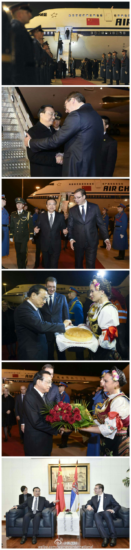 ??? 新華網(wǎng)北京12月16日電 據(jù)新華社“新國際”微博報道,當?shù)貢r間15日晚,李克強總理乘專機抵達塞爾維亞首都貝爾格萊德,出席中國-中東歐領(lǐng)導人會晤并正式訪塞,塞總理武契奇率兩位副總理及多位部長到機場迎接,塞女青年按照迎接貴賓的傳統(tǒng)禮儀獻上面包和鹽請他品嘗。兩國總理在機場進行了親切會見。