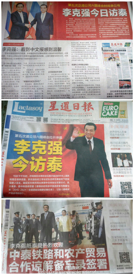 ??? 新華網(wǎng)北京12月20日電 據(jù)新華社“新國際”微博報道,泰國媒體紛紛在頭版頭條位置對李克強總理的泰國之行予以報道,社會各界高度關注。泰國《星暹日報》在頭版刊登總理大幅照片,稱總理此行將推動和見證中泰兩國之間簽署多份友好合作協(xié)議,并回顧了2013年李克強總理訪泰時的情景。