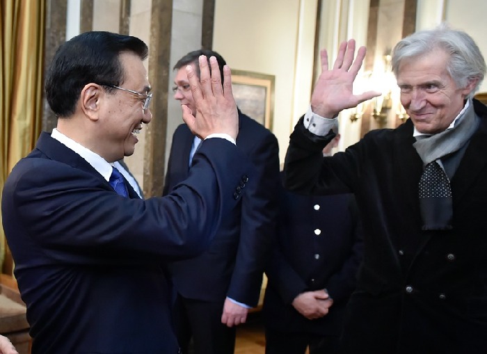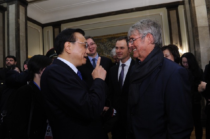 李克強(qiáng)與電影《瓦爾特保衛(wèi)薩拉熱窩》中“吉斯”的扮演者“對暗號”。中新社 劉震 攝