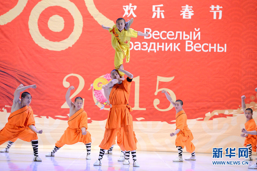 2月4日晚,在烏茲別克斯坦首都塔什干突厥宮,藝術(shù)家在表演中國武術(shù)和舞蹈。新華網(wǎng)記者 沙達(dá)提 攝