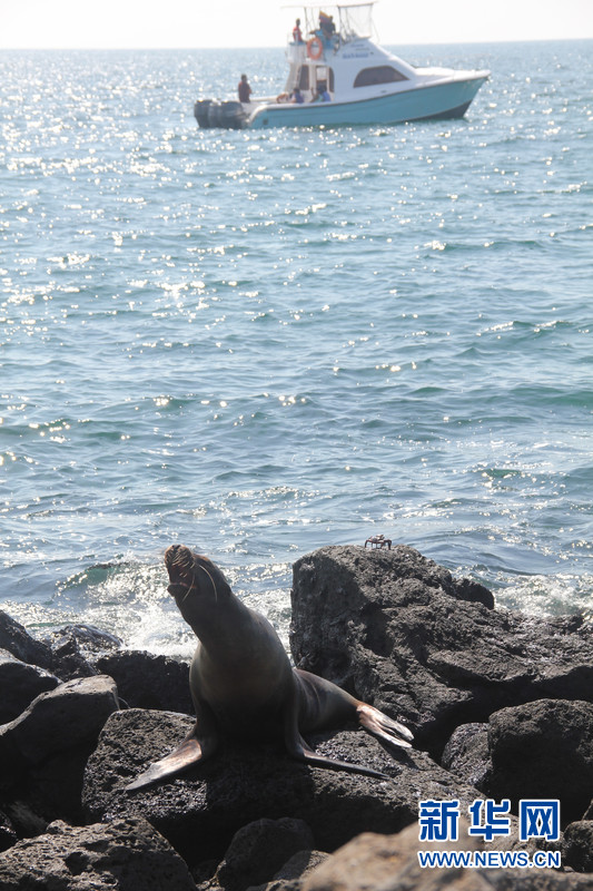 一只海獅在圣克里斯托巴(San Cristobal)島海邊的礁石上發(fā)出低叫,不遠(yuǎn)處有輪船駛過(guò)。