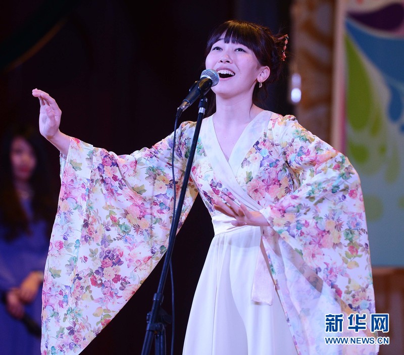 4月28日,在烏內(nèi)務(wù)部文化宮禮堂活動現(xiàn)場,塔什干孔子學(xué)院的ARUXAN(中文名:阿魯)在參加比賽。新華網(wǎng)記者 沙達提攝