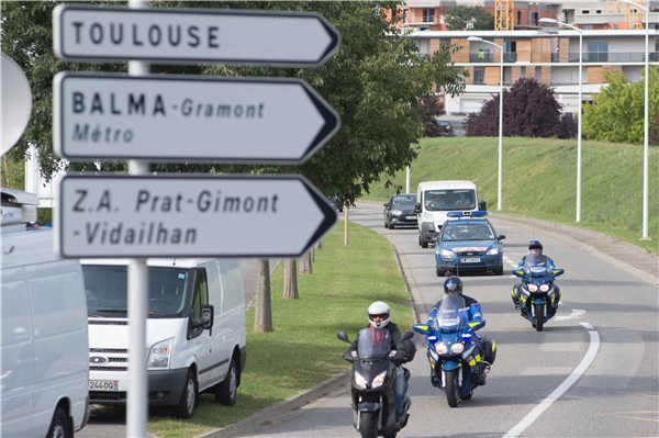 圖為2015年8月1日,在法國圖盧茲近郊,載有疑似馬航MH370航班殘骸的白色貨車駛?cè)牒娇占夹g(shù)分析機構(gòu)。新華社發(fā),弗萊德·朗瑟羅攝
