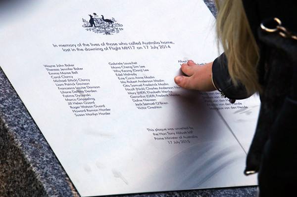 ↑2015年7月17日,在澳大利亞堪培拉議會(huì)大廈外,一名馬航MH17空難罹難者家屬撫摸紀(jì)念碑。